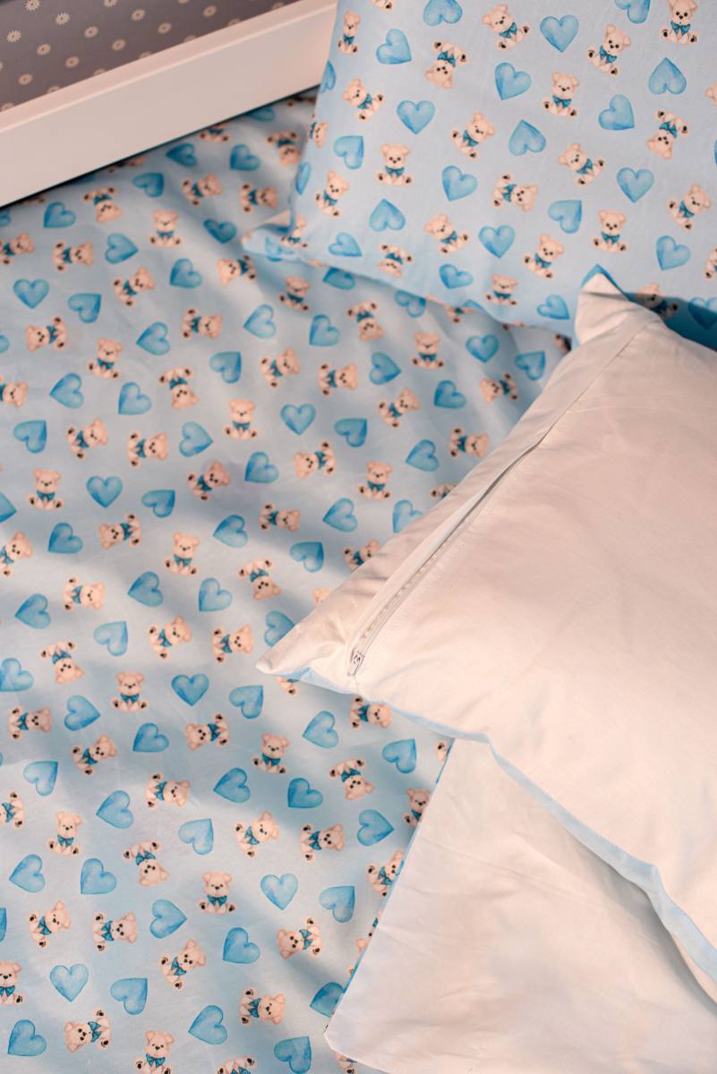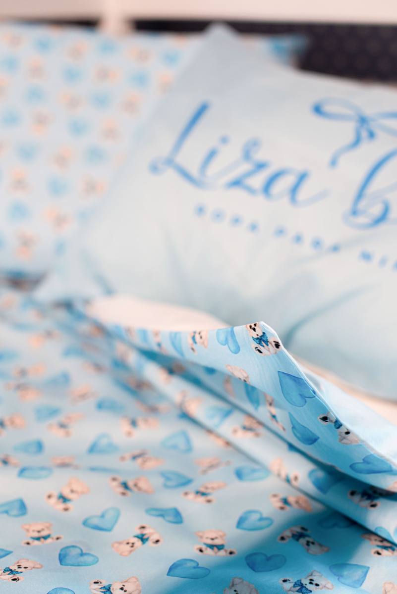 Иттер мен жүректер бейнеленген көк төсек жапқыштары