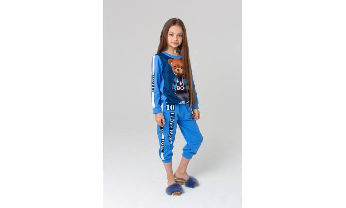 A light blue suit with application of fashionable brown bear in a tracksuit, sizes3 years – M size, knit wear. The white stripes on sleeves and trousers make this suit so stylish. A perfect option for every day, very bright and comfortable. It is that kind of wear which becomes one of the favorites among children.
