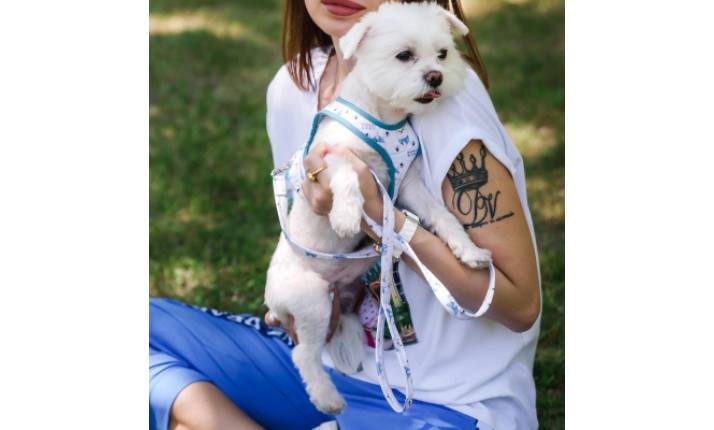 Leash and harness for dogs from the collection Pupsik, white with blue edging, durable knitted fabric, one size regulated by a button. Have you ever thought about how much time you spend walking with your pet? Makethistimemorepleasantandbrighter!