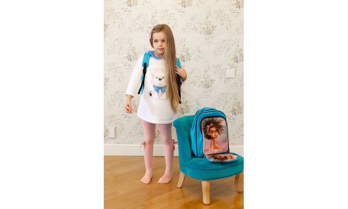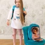 A white dress with blue neckpiece and big application of puppy in the center of neoprene, length – up to the knees, long sleeve, sizes 3-12. Bright blue, bright application. This dress is one of those in which children always smile, it is smart and gives the sense of a holiday!