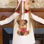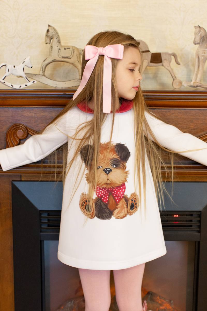 Lovely white dress of neoprene with neckpiece of bright pink color and a big application of a brown puppy in the centre, sizes 3-12 years. Its cut makes this dress so elegant, cause the skirt and the sleeves have an ideal length. In this dress she could look nice even in the castle of the queen!