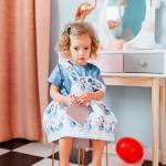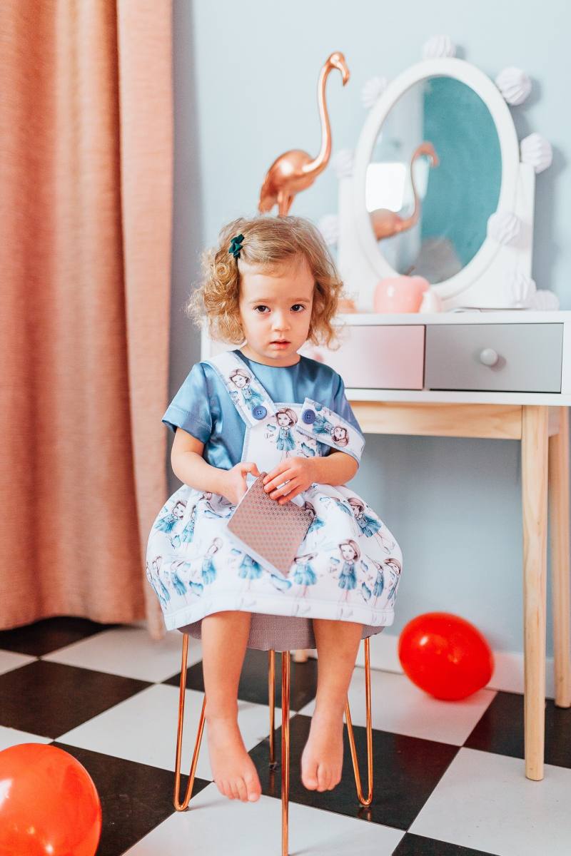 A beautiful pinafore skirt of neoprene combined with atlas in two classical options, pink and green. Looks like two perfectly matched garments. Atlas give it tenderness, printings with dolls – some individuality, and these cute bottons remind us that this stylish creature is a little girl