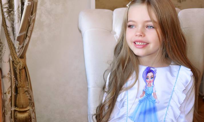 White long-sleeved dress made of silk with printing of the new blue doll – princess just like your little girl, sizes 104-122. Sophisticated corsage with flounce and thin blue lines on both sides will emphasize its thought-out style. This dress will suit ideally to children’s matinee or for visiting and it‘ll make her mood fabulous!