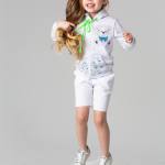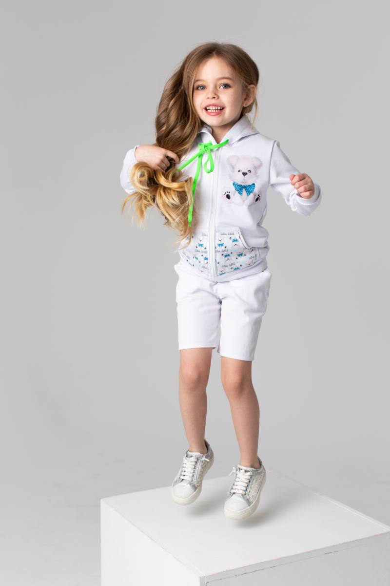 A light white hoody of mollettone in boucle with hood and pockets of comfortable form with printings of the puppy and an application on the left part (white with blue). And a bright accent so necessary – a lettuce green lace of neoprene! Sizes 3-12 years. It matches perfectly with shorts or trousers. This hoody is a “must have” in the wardrobe of the little princess!