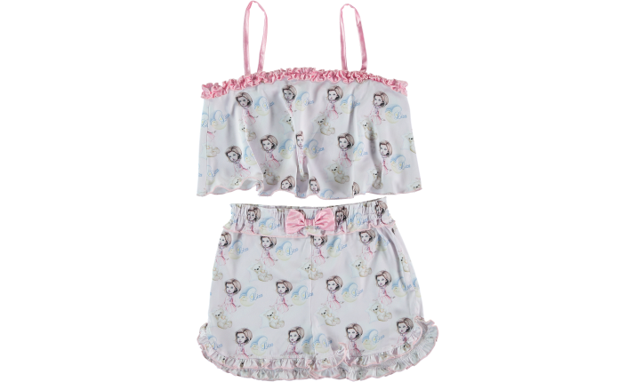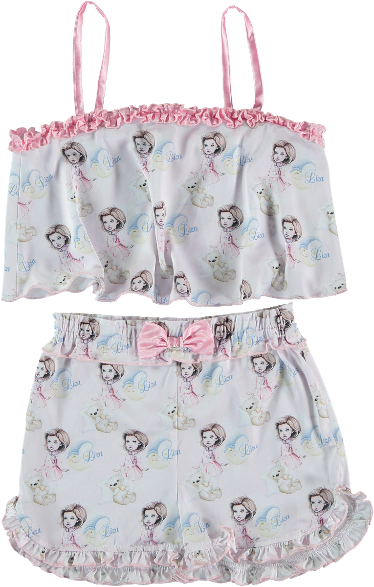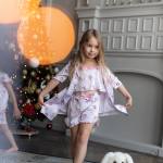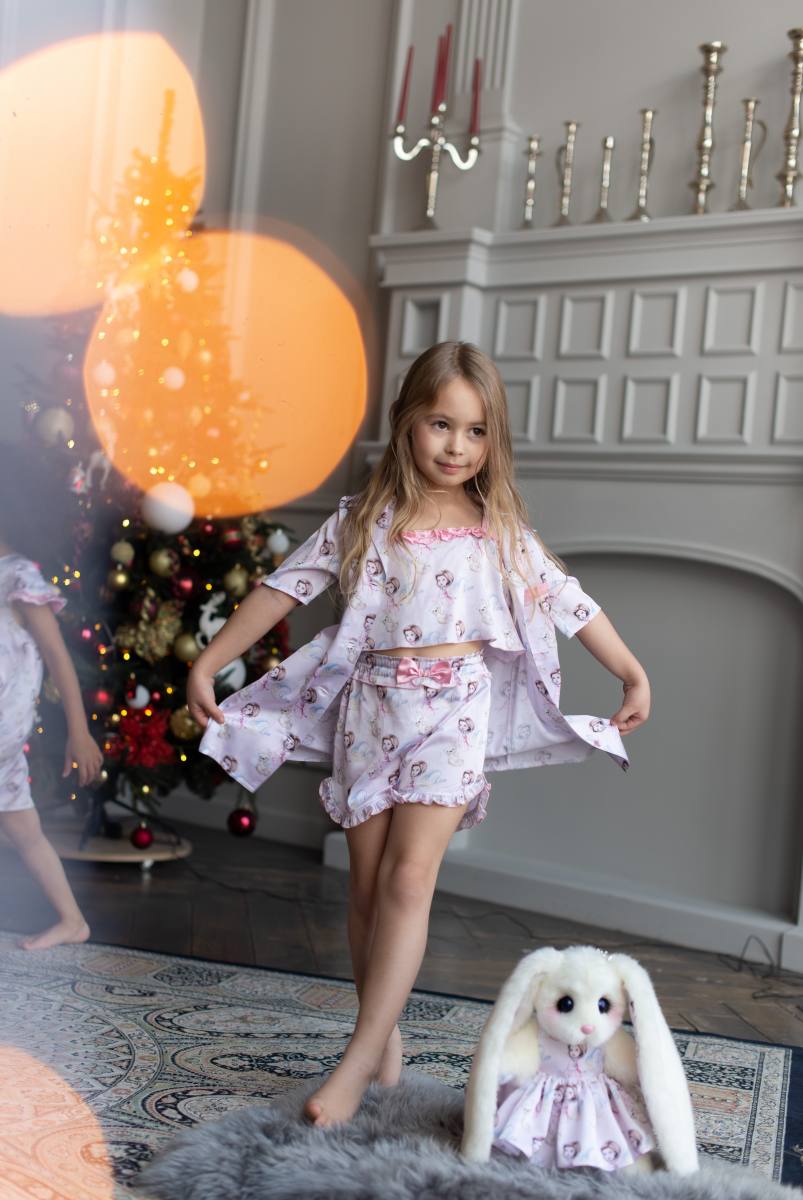 A lovely pyjamas, shorts and undershirt, with dolls, made of silk, sizes 3-12 years. The charming ruche provide this kit with a good mood. A perfect option for sleeping. Your girl won’t be hot in this pyjamas, the silk is so nice for gentle kid’s skin.