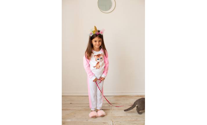 Beautiful and comfortable suit made of knitwear, sweatshirt and pants, with silk application, four curious combinations of colors – white with light pink sleeves and orange kitten in the center, white with blue sleeves with kittens and application of grey kitten and also white with sleeves with puppies and application of puppy - with his hat and without it, sizes 2-5 years. Great quality and soft colors. Such a such will adorn weekdays of your beauty, perfect option for visiting or going for a walk!