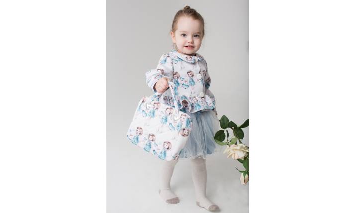 Delicate suit very soft, with long sleeve and buttons: a neoprene shirt with prints of the doll in green – a special symbol of the brand, and a plain skirt, two layers chiffon, sizes 3-12 years. This suit is so vaporous, you can be sure that everyone will notice it, it is irreplaceable at weekends, really smart!