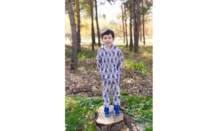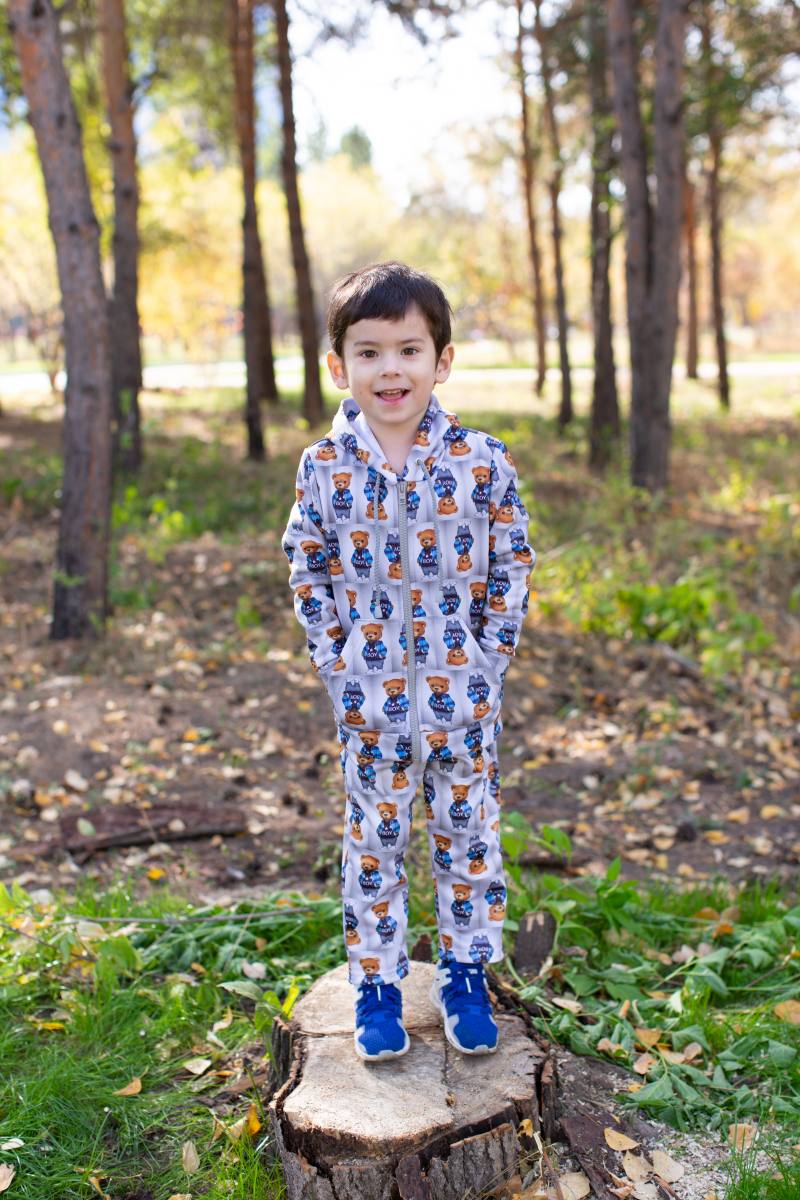 Long-expected collection for boys! Stylish grey tracksuit with printings of the popular bear in a blue suit, clothing mollettone, optimal combination of 50% of polyester and 50% of cotton, sizes 104-122. It is neat and suits ideally to the little handsome boy. Boys spend so much time outside that this tracksuit will soon become the irreplaceable piece of clothes in his wardrobe!