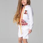 A light white hoody of mollettone in boucle with hood and pockets accentuated with this bright color with printings of the puppy and an application on breast (white with raspberry-pink). An orange lace of neoprene! Sizes 3-12 years. It matches perfectly with shorts or trousers. Itiscomfortable, fashionableandstylish!