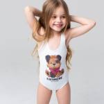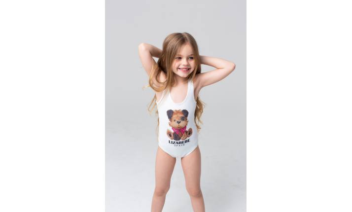 White swimsuit with a big application of a brown puppy and the script Lizabebe Spain, sizes 3-12 years. The color is so classical for a swimsuit but with a bright accent so important! She’ll associate a lot of emotions and positive moments with this very swimsuit, because there’s no season so funny like the summer, everyone to the beach!