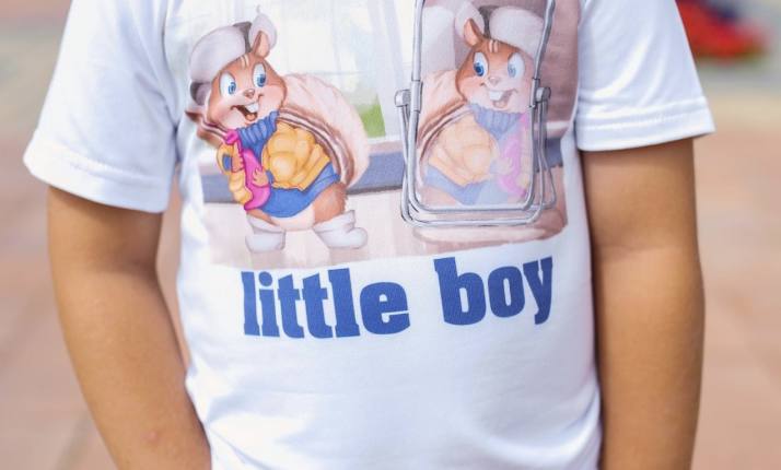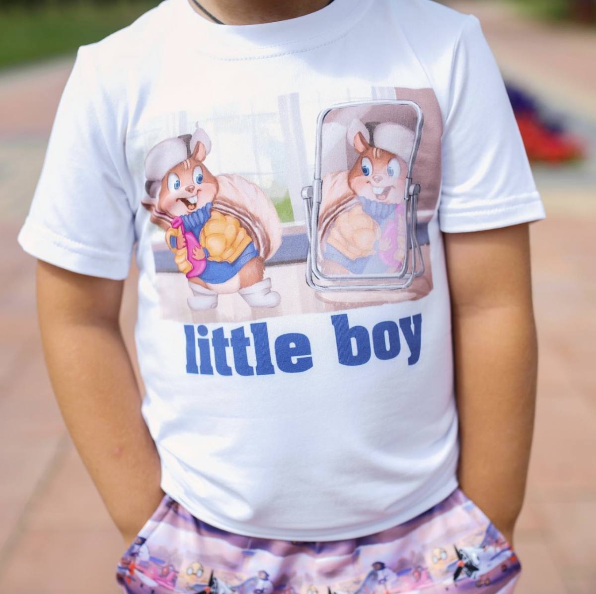 Fashionable T-shirt with printings of funny chipmunks and the script Little boy, clothing coolmax, optimal combination of 95% coolmax and 50% of elastane, sizes 104-122. It goes ideally to hoody and trousers from the same collection, favorite printing now on a T-shirt. Basic piece of clothes in his wardrobe, recognizable and unique!