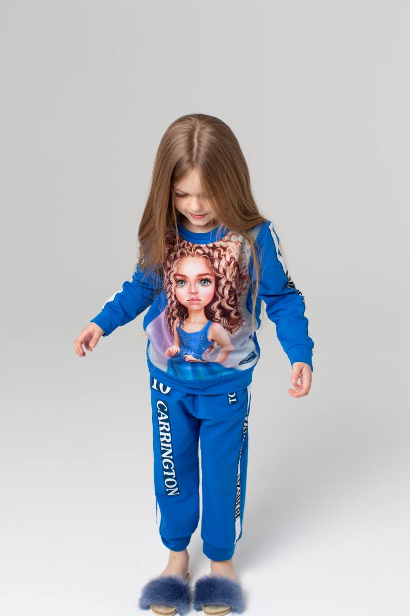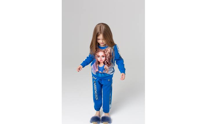 Прекрасный трикотажный костюм с длинным рукавом, штанишки с надписями от Каррингтон и кофта с куколкой от Каррингтон и надписями на рукавах, два цвета – голубой и белый, размеры с 3 лет до размера М. Эта вещь – базовая в ее гардеробе, потому что она очень удобная и практичная, но так же это очень элегантно и стильно для любого случая благодаря аппликациям.