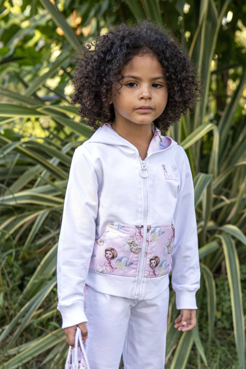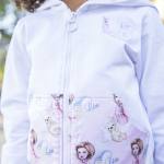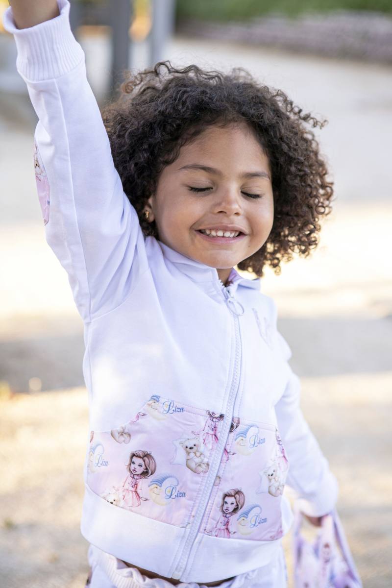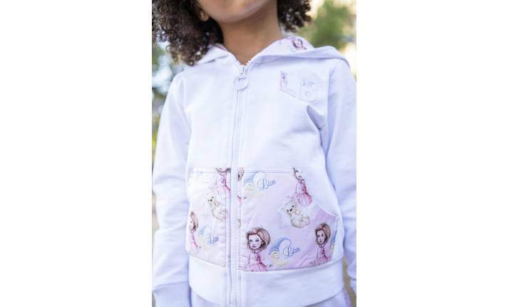La sudadera cuenta con delicados detalles estampados y bordado, cierre con cremallera y puños prácticos. El pantalón tiene cintura elástica y detalles decorativos que permiten total libertad de movimiento, ideal para el uso diario y actividades al aire libre.