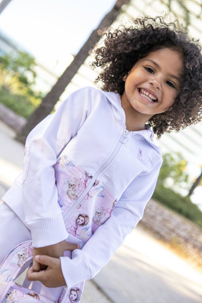 Conjunto infantil cómodo y moderno para niña, compuesto por sudadera con capucha y cremallera y pantalón a juego. Confeccionado en un tejido suave y agradable al tacto que garantiza comodidad durante todo el día.