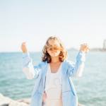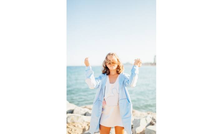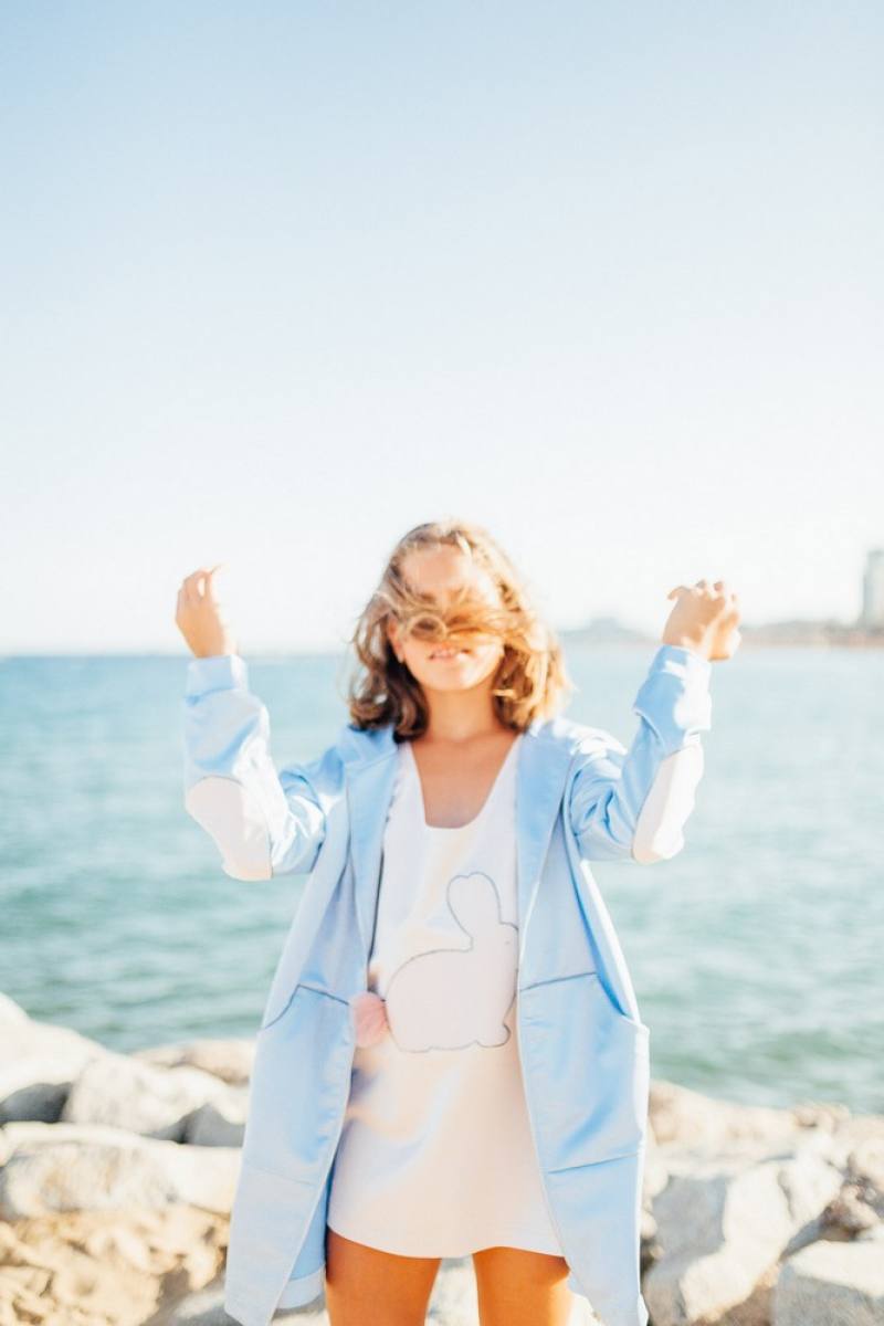 Camisa de atlas de color azul celeste con capucha y bolsillos con una aplicación de conejito en la espalda, tallas 3-12. Es muy elegante y moderno al mismo tiempo, y es una opción ideal para un paseito tranquillo por la playa al atardecer.