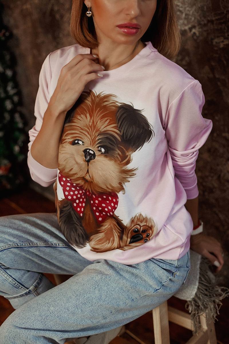Camisa rosa de manga larga, tela 50/50 poliéster algodon, con una aplicación grande y viva de un perrito marrón con lazo rosa a lunares para mama. Este perrito amistoso siempre atrae las miradas y hace la gente sonreir. Es muy cómoda y de moda.