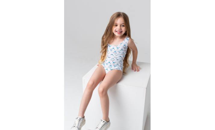 Bañador blanco con perritos blancos con lazo azul, un juego bonito de matices diferentes del blanco, una combinación suave, tallas 3-12 años. Este bañador es simple y irrepetible al mismo tiempo, dará énfasis a la belleza de la niña, su pelo y sus ojos! No tiene desventajas!
