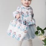Traje delicado muy suave, manga larga, con botones: blusa de neopreno con prints de la muñeca – un simbol especial de la marca, y falda lisa de dos capas de chiffón, tallas 3-12 años. Este traje es tan vaporoso, puede estar segura que los demas lo noten, es lo imprescidible los fines de semana, muy garifo!