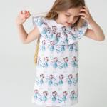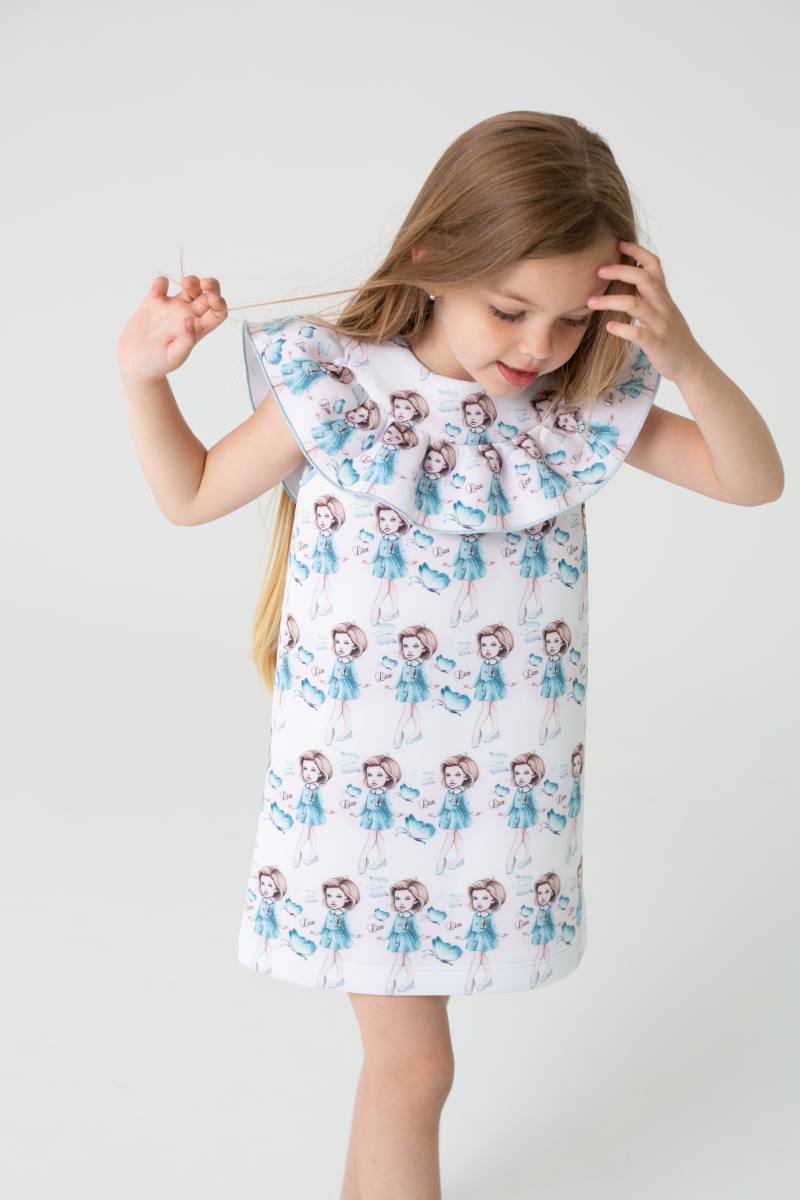 Un vestido con prints de la muñeca y un cuello muy original, el diseño especial que lo hace al vestido tan ligero. En dos colores rosa y azul. Es de neopreno, tallas 3-12 años. Cómprele a su guapita la posibilidad de sentirse única!