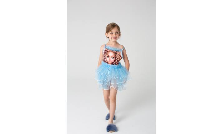 Un vestido de seda con el dibujo de Carrington en el top y una falda muy de moda en estilo ballet, color azul claro, tallas 3-12 años. Queda ideal y es lo nuevo del mundo de moda hoy. Es una juguetona en este vestido, se siente tan cómodo y le encanta llevarlo!