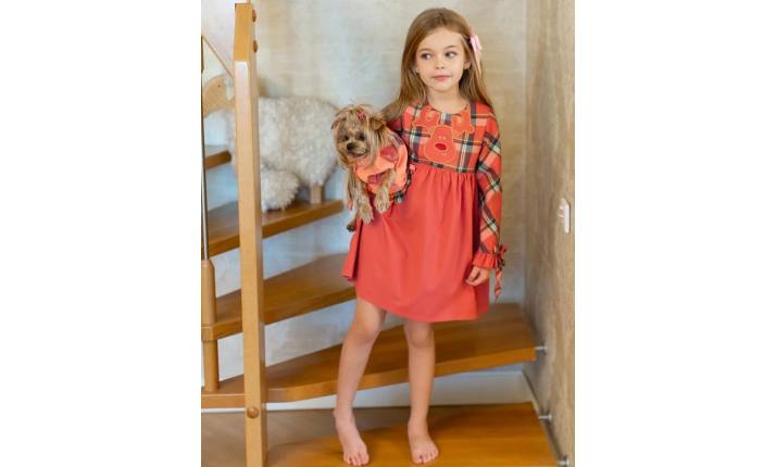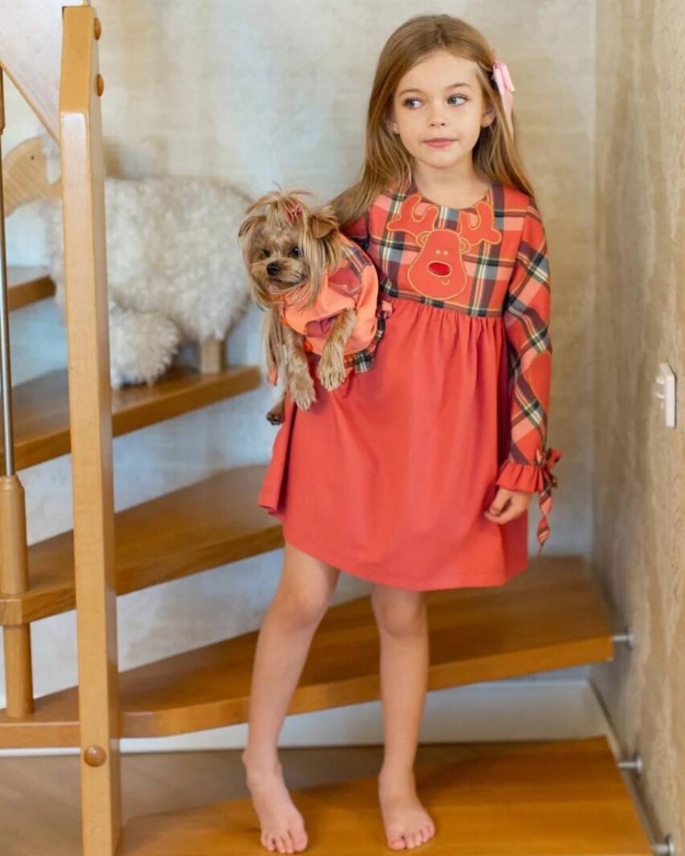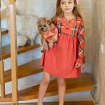 Un vestido de estilo de tela de gabardina, un diseño interesante: falda y mangas lisos, y a cuadros en el centro con aplicación de cervato, tallas 3-12 años. Qué color te gusta más? Como hay seis y hay de que elegir! Son terracota, azul, marrón, amarillo, naranja a cuadros rojos y rosa a cuadros violeta. Son parecidos y distintos al mismo tiempo. Este vestido une el Norte con su cuento de cervatos y el Sur con estos colores tan calores!