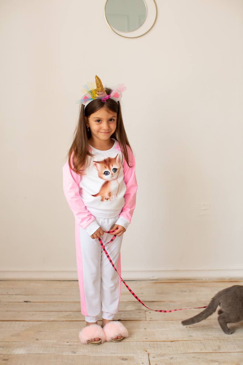 Замечательный комфортный костюм из трикотажа, свитшот и штанишки, с аппликацией из шелка, четыре интересные расцветки – белый с нежно розовыми рукавами и рыжим котенком в центре, белый с голубыми рукавами с котятами и аппликацией с серым котенком, а также белый с рукавами с собачками  и аппликацией с собачкой- в шляпке и без, размеры 2-5 лет. Отличное качество и мягкие тона. Такой костюм украсит будни вашей красотки, прекрасный вариант для похода в гости и прогулки!
