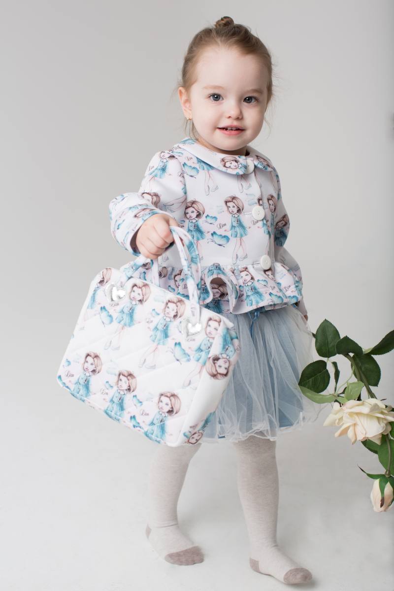 Нежный костюм, очень мягкий, с длинным рукавом, на пуговицах – кофта из неопрена с принтами куколки в зеленом – особого символа марки, и юбка двуслойная шифоновая, размеры 3-12 лет. Этот костюм такой воздушный, можете быть уверены, что его заметят все, он незаменим в выходные, очень нарядный!