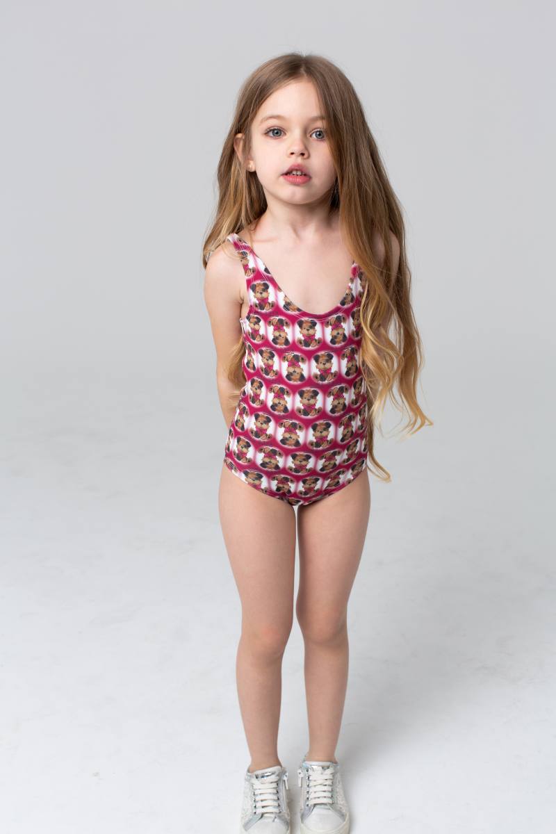 Малиновый купальник со множеством принтов в виде коричневой собачки из мягкой ткани, которая не испортится под влиянием солнца или воды, размеры 3-12 лет. Яркий цвет играет в лучах солнца! Ваша девочка будет очень заметна на пляже, она словно ягодка в этом купальнике!