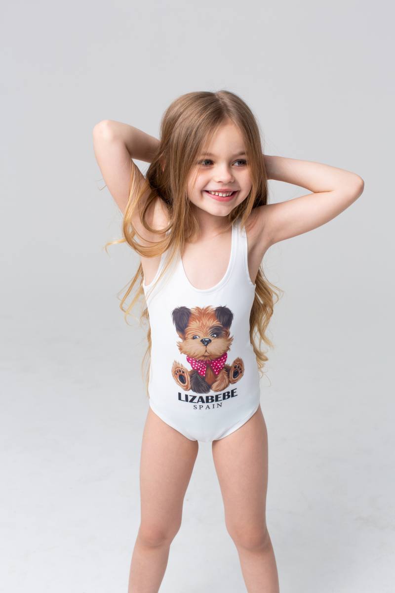 Белый купальник с большой аппликацией в виде коричневой собачки и надписью LizabebeSpain, размеры 3-12 лет. Цвет – такой классический для купальника, то с таким важным ярким акцентом! У него будет связано много эмоций и положительных моментов с эти самым купальником, ведь нет более веселого времени года, чем лето, все на пляж!