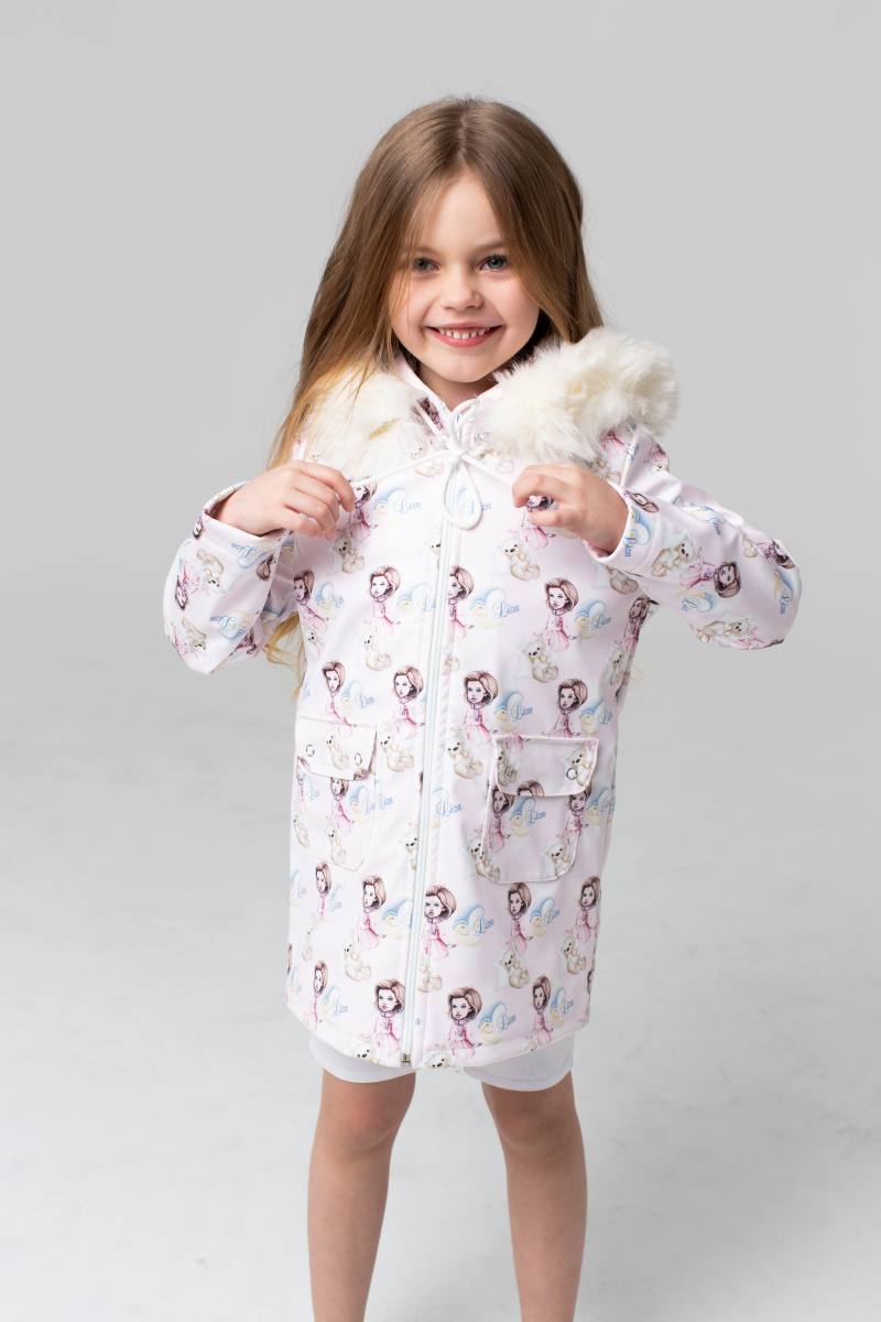 Белая куртка осень-весна с принтами куколок из водоотталкивающей ткани софт шелл, на молнии, с накладными карманами и искусственным мехом на капюшоне, размеры 3-12 лет. Главное достоинство такой куртки – ее практичность. В ней вашей малышке не страшны холод и влажность. Ей будет тепло и комфортно. Но это тот самый случай, когда прекрасное качество сочетается со стилем и красотой!