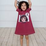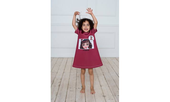 Платье с коротким рукавом, очень милое, бордового цвета, с принтом куколки в середине, из неопрена, размеры 3-12 лет. Это такое индивидуальное платье подойдет для праздника или другого события. Оно очень элегантное и в то же время очень удобное, так что она сможет часами бегать, играть и танцевать. Это комфорт, который можно потрогать.