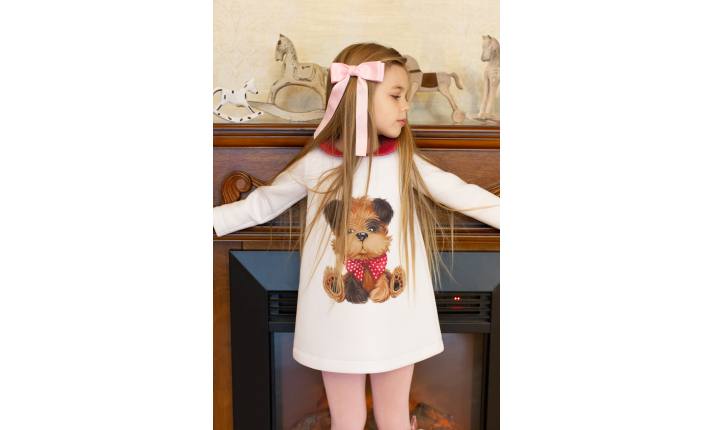 Приятное белое платье из неопрена с ярко розовым воротником и большой аппликацией в виде коричневого щенка в центре, размеры 3-12 лет. Крой платья делает его таким элегантным, ведь юбка и рукава имеют идеальную длину. В этом платье она выглядела бы прекрасно даже во дворце королевы!