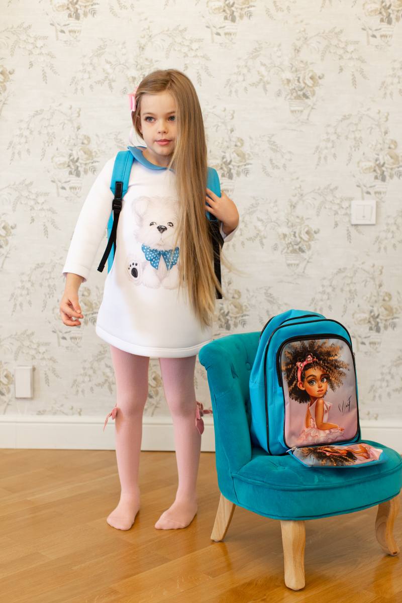 Белое платье с голубым воротником и большой аппликацией в виде собачки в центре из неопрена, длина – до колен, длинный рукав, размеры с 3-12. Яркий голубой, яркая аппликация. Это платье из тех, в которых дети всегда улыбаются, оно нарядное и создает ощущение праздника!