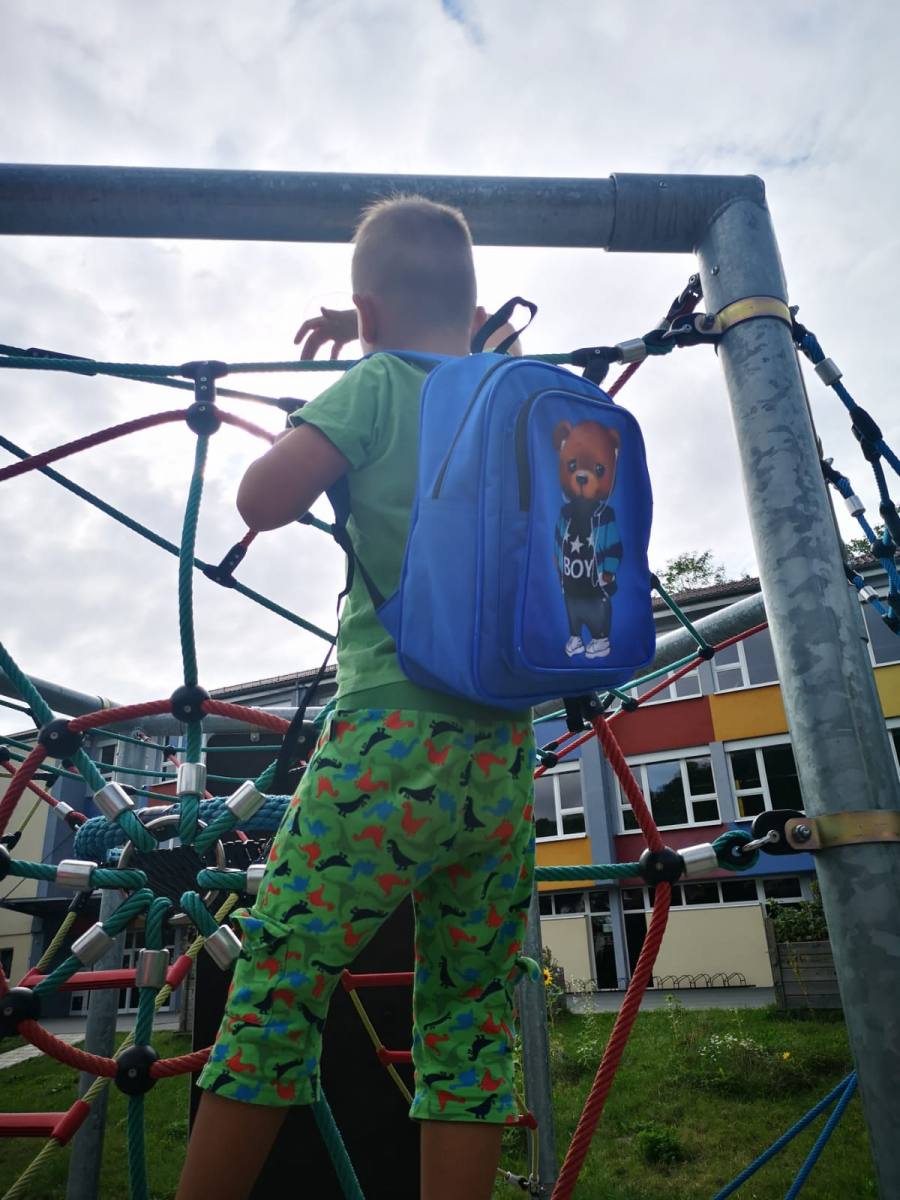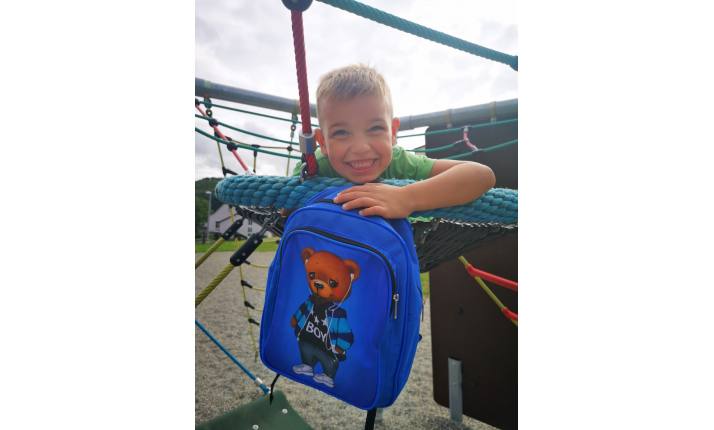 Отличный синий рюкзак из коллекции Мишки, с принтом в виде модного мишки в наушниках и мастерке, ткань 100% полиэстер. В этом рюкзаке продумано все, оптимальный размер – он вместительный и не громоздкий, удобный карман для мелких принадлежностей, качественные ручки. Такой мишка будет только у вашего ребенка, ведь он специально создан нашими дизайнерами. Отлично сочетается с синим костюмом из коллекции Мишки.