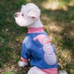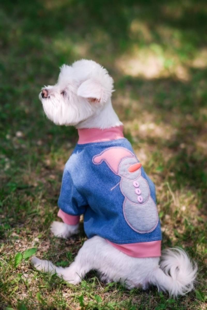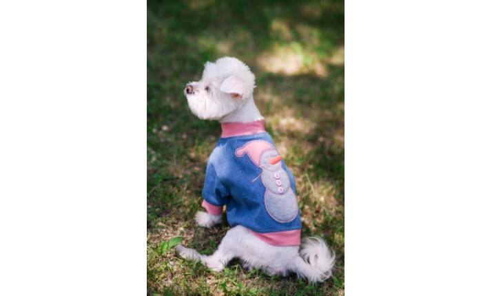 Новинка для любимых домашних питомцев! Джинсовая синяя кофточка для собаки с розовым воротом и рукавами и аппликацией в виде снеговика на спине, размеры XS, S, M, L. Ваш любимец точно не останется незамеченным на прогулке – именно такие вещи создают настроение и делают жизнь ярче!